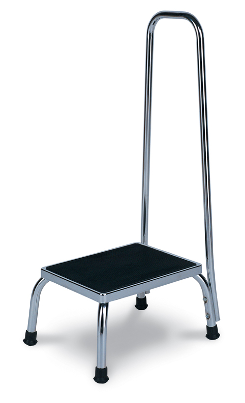 The 4230 Chrome Steel Footstool Has A “no Tip – No Slip” Design Made Possible By The Rubber Ribbed Top Over Chrome Steel Platform And The 1″ Chromed Steel Legs With Crutch Tips. This Model Adds A Handle For Extra Patient Stability.