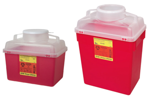 14 qt BD™ multi-use nestable sharps collector, 11.5 in. x 12.5 in. x 8.5 in. Red base, natural tope with large funnel entry. Solid cap closure for leak resistant transit. Autoclavable.